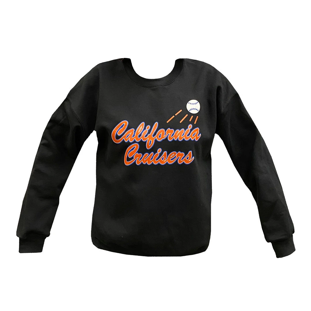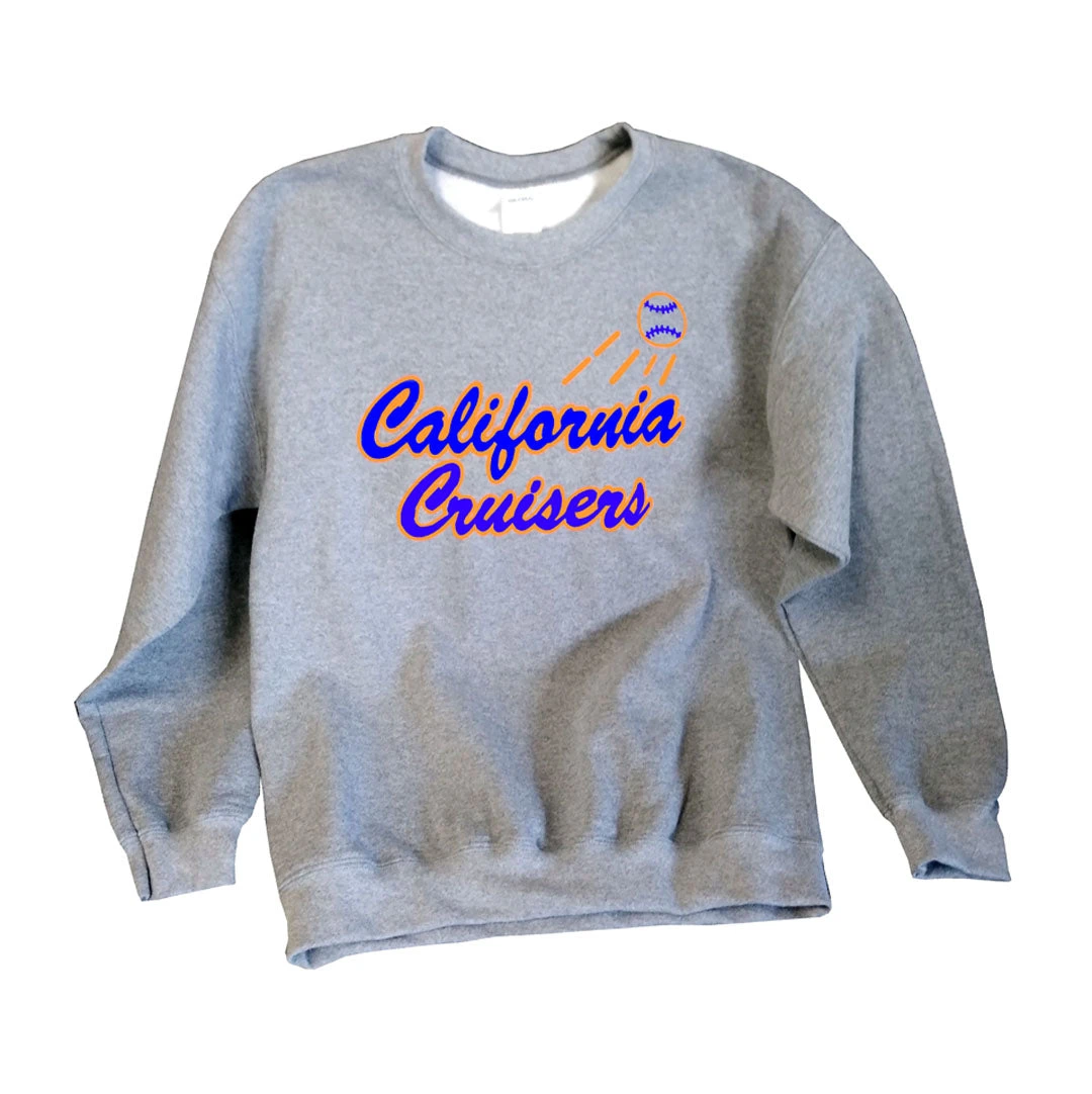 - Gildan Men’s crew sweatshirt with California Cruisers logo screened on front.